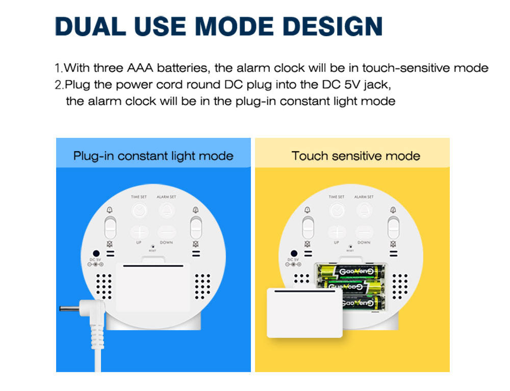 This digital alarm clock is a beautifully designed clock with multiple features. It works either with USB cord or with 3 AAA batteries. Alarm is snooze-able for 5 minutes.