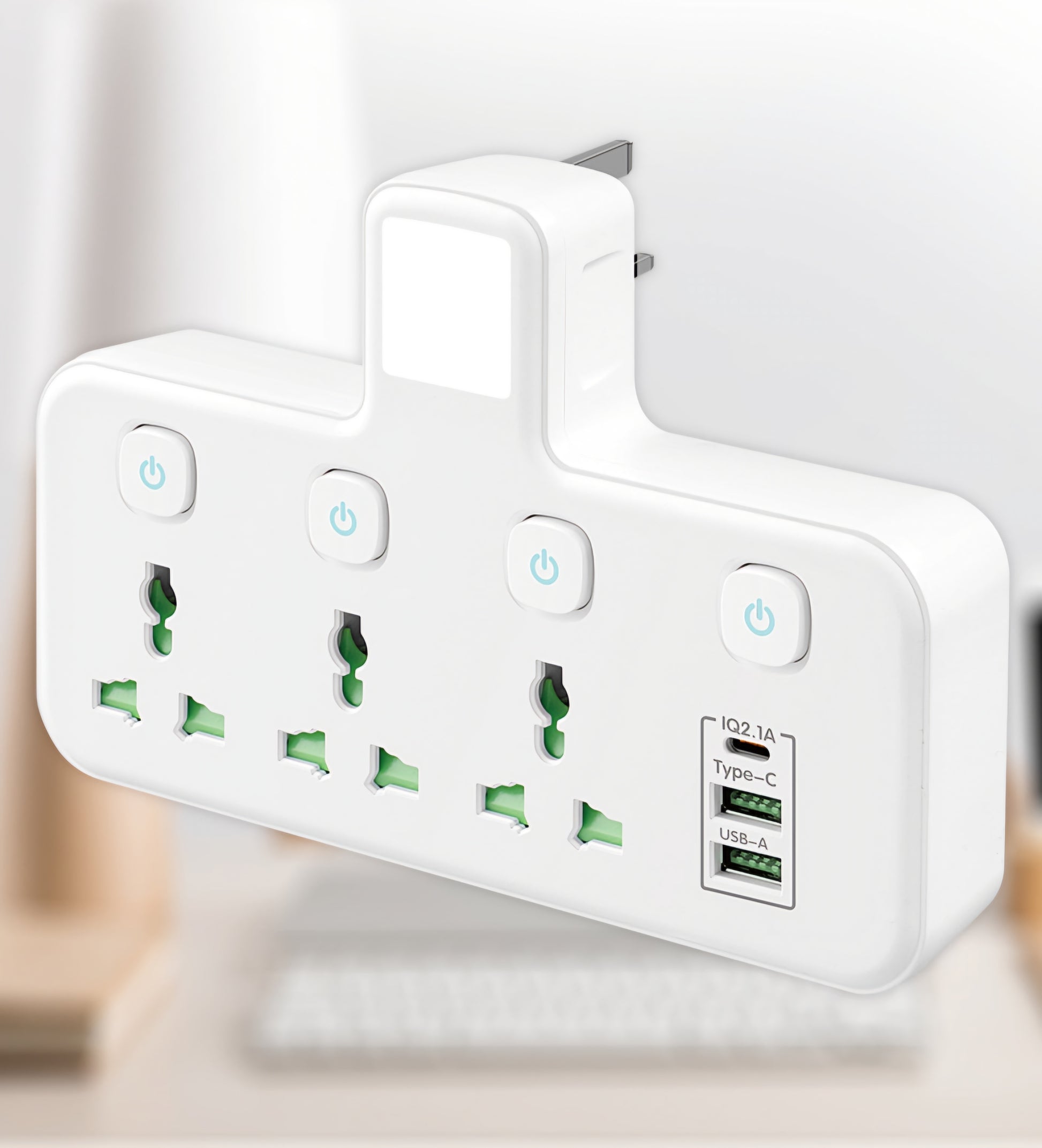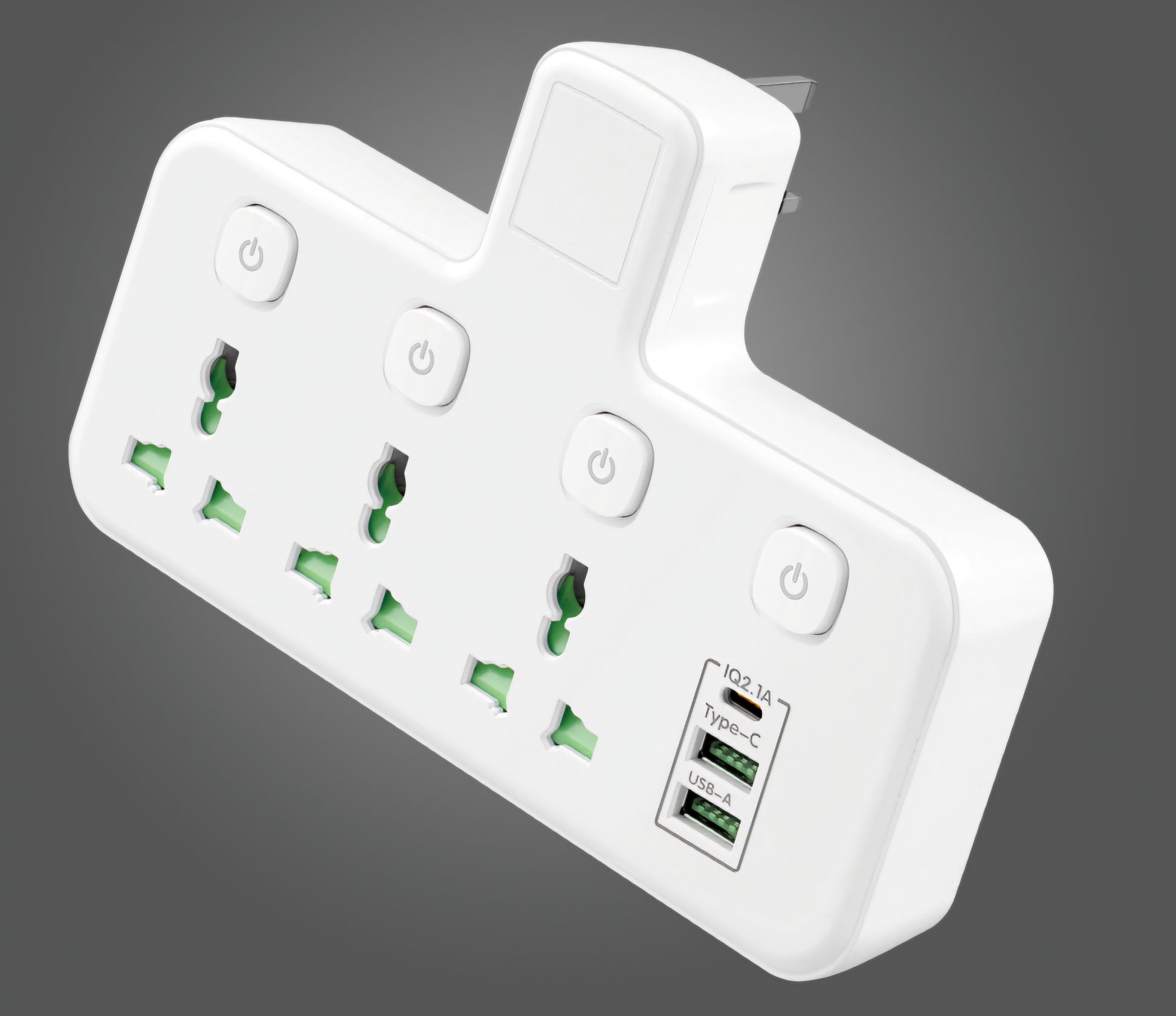 - Number of Ports: 3 sockets + 2 USB + 1 Type C